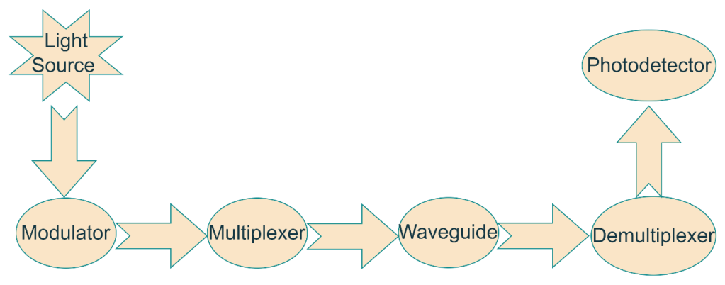 A source is used to generate continuous-wave light. The source can be off-chip or in-chip in case of InP or Heterogeneous platforms[5]. A modulator is used next to transfer data from the electrical to the optical domain. When more than one wavelength is needed, a multiplexer will combine the data in one wavelength to the waveguide. When outside the chip, the waveguide is usually the optical fibre, due to its several advantages over copper wires (see previous blog post). Then, a de-multiplexer will split the data back to the channels to a photodetector that will recover the data to the electrical domain[5]. Check out Figure 1 for the main building blocks of optical communication.